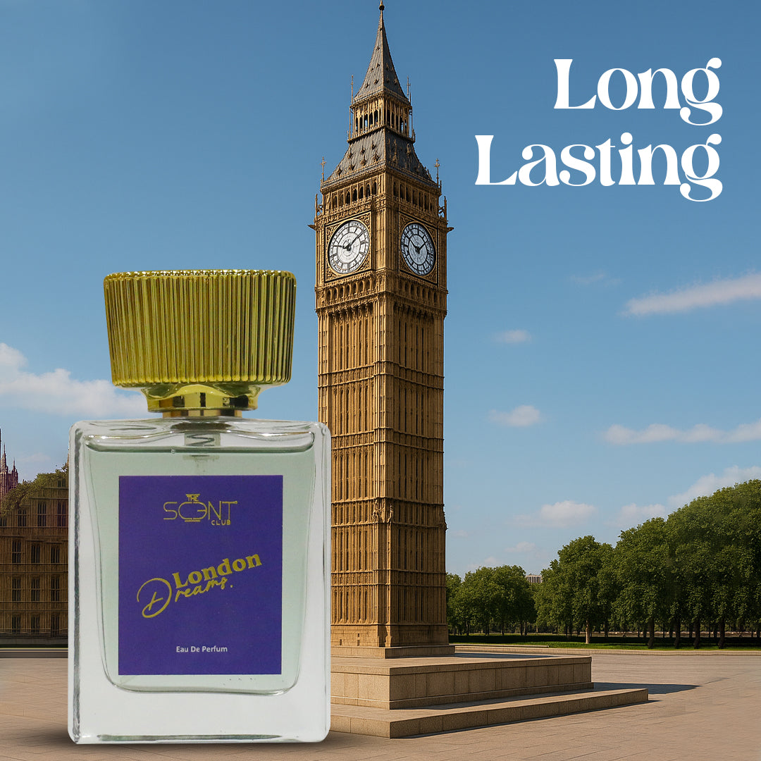 Encased in a sleek glass bottle with royal blue accents and a golden cap, London Dreams reflects confidence, class, and the unmistakable charm of city sophistication.